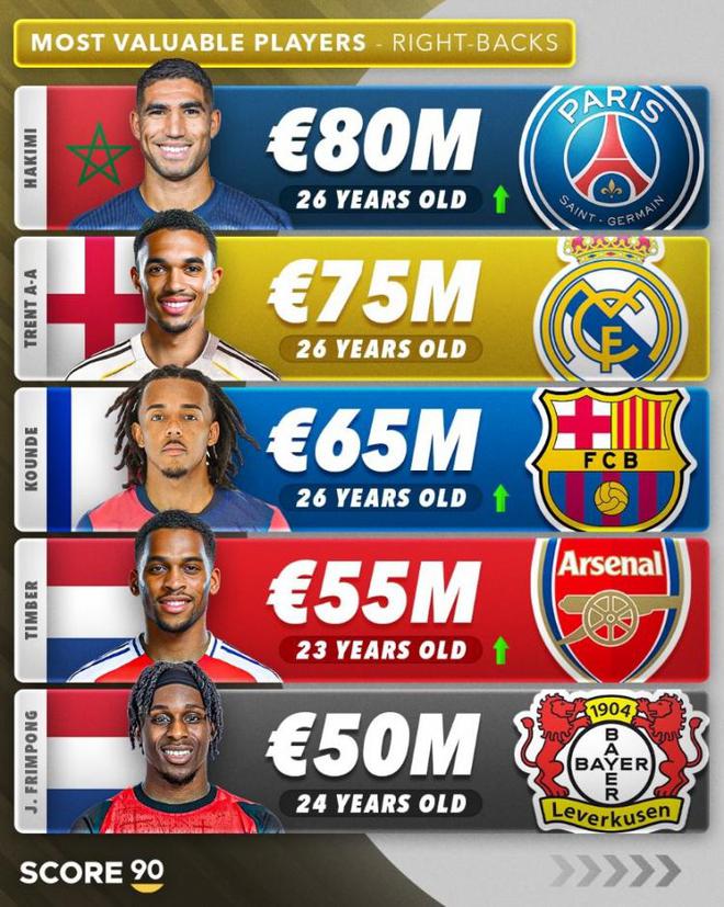 6月13日西甲日報宣報訊2024-25賽季結(jié)束,Score 90更新了右后衛(wèi)身價排行,巴黎圣日耳曼后衛(wèi)阿什拉夫8000萬歐元第一,皇馬新援阿諾德7500萬歐元第二。