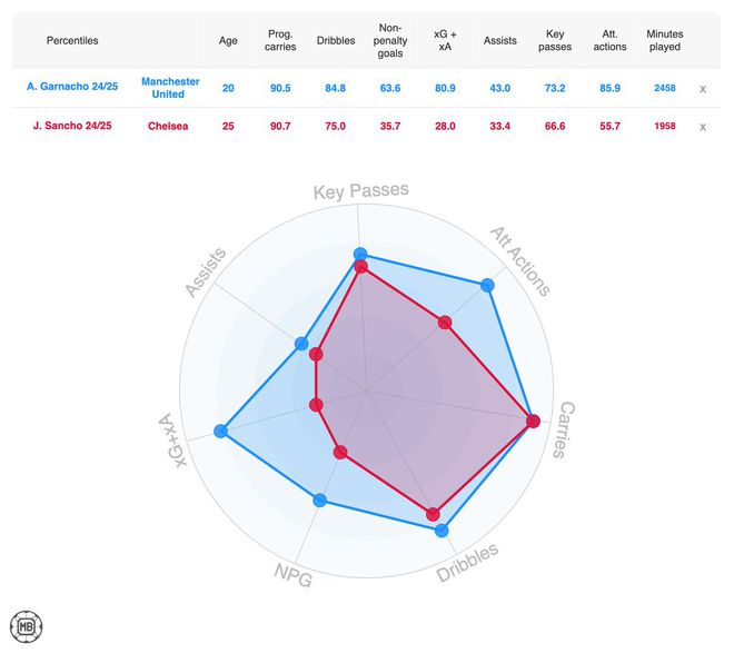 北京時(shí)間6月18日英超日?qǐng)?bào)宣報(bào),知名數(shù)據(jù)網(wǎng)站DataMB面對(duì)離隊(duì)傳聞的加納喬和即將回到曼聯(lián)的桑喬,進(jìn)行了二人24-25賽季的數(shù)據(jù)對(duì)比。