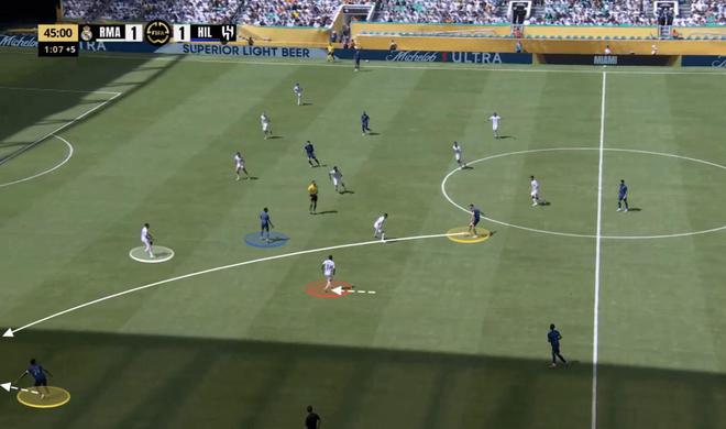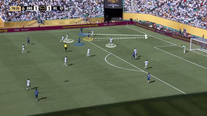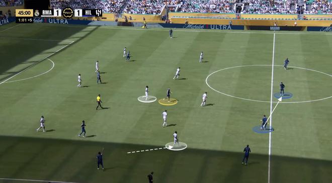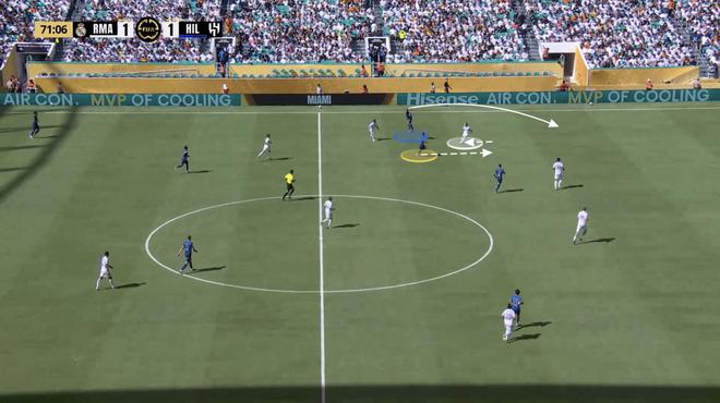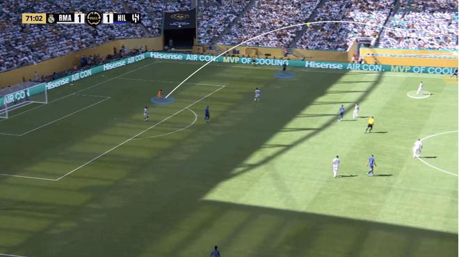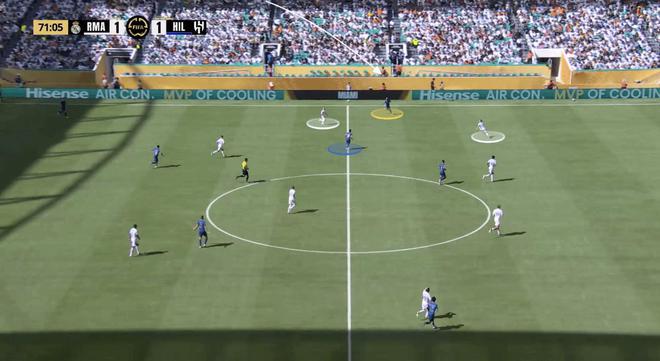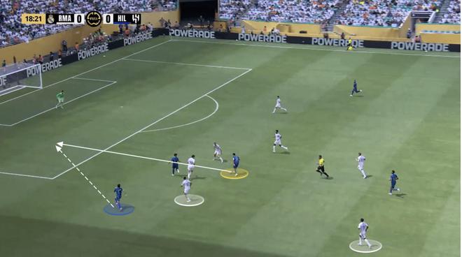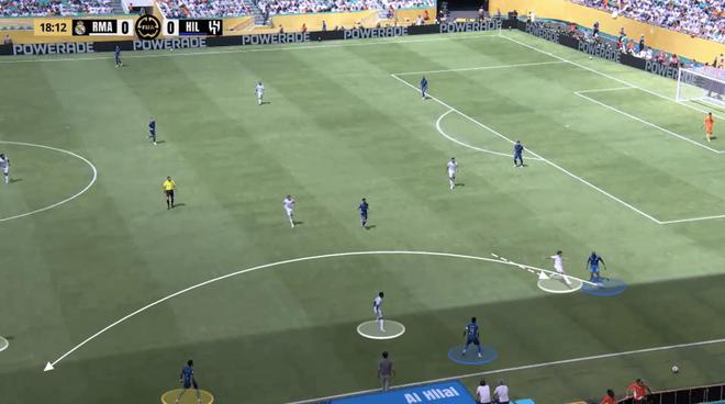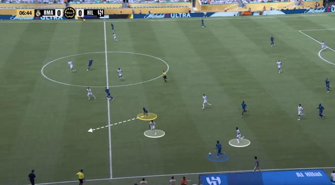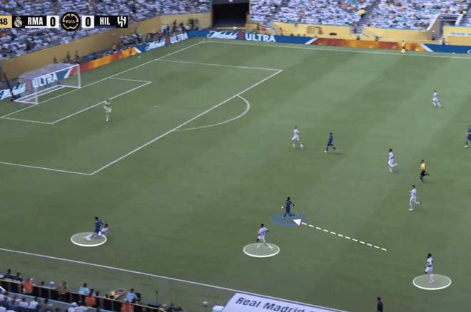 第三次險情源于新月后腰內(nèi)維斯的特殊站位:他游弋至左后衛(wèi)區(qū)域,而洛迪則前壓。當(dāng)門將布努準(zhǔn)備長傳時,皇馬右邊鋒卜拉欣-迪亞斯的選位令人費(fèi)解——或許是為避免加西亞單獨(dú)面對庫利巴利和內(nèi)維斯。