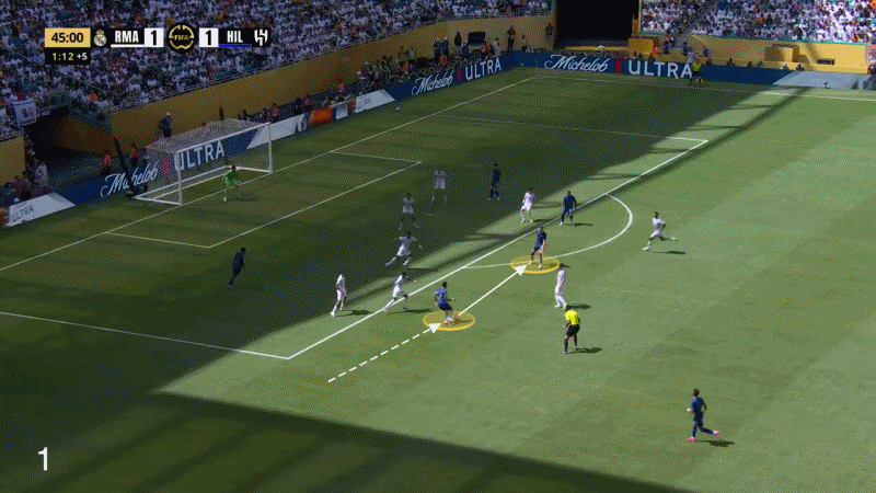 比賽后段,新月再度在左路形成人數(shù)優(yōu)勢:米林科維奇-薩維奇分球給穆罕默德-卡努時,洛迪從迪亞斯身后悄然前插。