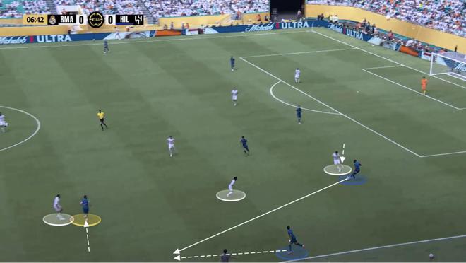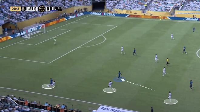 本質(zhì)而言,皇馬右邊鋒的防守響應(yīng)始終慢半拍。例如這次庫利巴利長傳找洛迪。