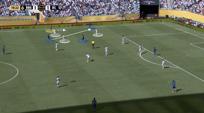 另一回合中,新月左路通過換位制造殺機(jī)。起初阿諾德、巴爾韋德和羅德里戈的站位尚屬合理。