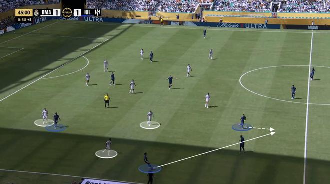 以這次防守為例(見下方組圖):當(dāng)加西亞上前壓迫庫利巴利時,羅德里戈本應(yīng)堅(jiān)守位置以引導(dǎo)對手向邊路出球。但新月左邊鋒薩勒姆-達(dá)瓦薩里通過內(nèi)切牽制阿諾德,導(dǎo)致庫利巴利分球后,雷南-洛迪得以在真空地帶輕松接球。