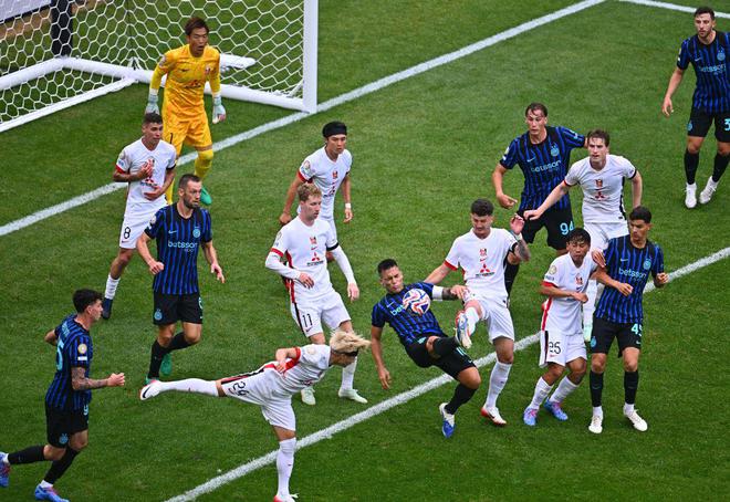 眼看比賽就要結(jié)束,國(guó)米拿出他們最擅長(zhǎng)的進(jìn)攻方式。第78分鐘,角球開出來,國(guó)米球員勞塔羅背身側(cè)勾,將球打進(jìn),1-1。這個(gè)進(jìn)球非常精彩,浦和紅鉆的后防線都看呆了。