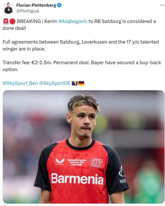 普萊滕伯格透露,勒沃庫(kù)森邊鋒阿拉貝戈維奇轉(zhuǎn)會(huì)薩爾茨堡的交易已經(jīng)敲定,兩家俱樂(lè)部達(dá)成全面協(xié)議,轉(zhuǎn)會(huì)費(fèi)200萬(wàn)到250萬(wàn)歐元,協(xié)議中包含回購(gòu)條款。