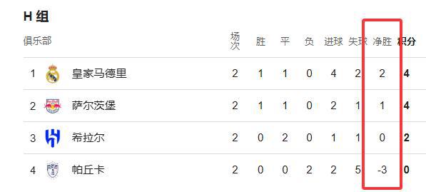 3、皇馬平薩爾茨堡紅牛,三隊同積5分,因三隊相互均為平局,因此直接比較“三隊小循環(huán)”相關(guān)球隊的總進(jìn)球數(shù)。
