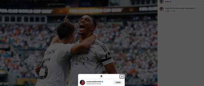 收獲皇馬生涯首勝的阿諾德在社交媒體慶祝勝利,這位皇馬后衛(wèi)發(fā)布的圖片是和居萊爾一起慶祝的照片,而點贊列表中出現(xiàn)了阿諾德的利物浦前隊友索博斯洛伊。