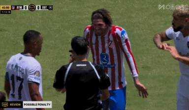 第45分鐘,馬競(jìng)傳球到禁區(qū)內(nèi),索爾洛特頭球點(diǎn)下來(lái),阿爾瓦雷斯禁區(qū)內(nèi)拼搶時(shí)被踢了一下倒在地上,隨后VAR介入,主裁判觀看視頻回放確認(rèn)沒(méi)有點(diǎn)球!↓