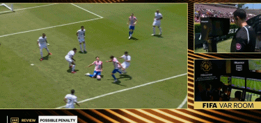 第45分鐘,阿爾瓦雷斯禁區(qū)內(nèi)被踩倒,主裁判觀看VAR后判罰瑟洛特推人犯規(guī)在先
