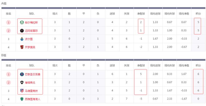 積分榜方面,A組兩場對決都以平局收場,這樣的話4隊的排名就沒有變化,帕爾梅拉斯和邁阿密國際攜手晉級,梅西職業(yè)生涯36次小組賽全部出線。帕爾梅拉斯1個凈勝球優(yōu)勢拿到小組第1,邁阿密國際就不得不在16強就面對實力強大的歐冠冠軍巴黎,這樣的話梅西職業(yè)生涯將首次對陣舊主。B組前3都是2勝1負積6分,三隊一個內(nèi)循環(huán)的擊敗對手,這樣的話就直接拼凈勝球,巴黎5個凈勝球小組第1晉級,馬競則是為首輪0:4慘敗買單,最終2個凈勝球的差距,小組第3被淘汰。