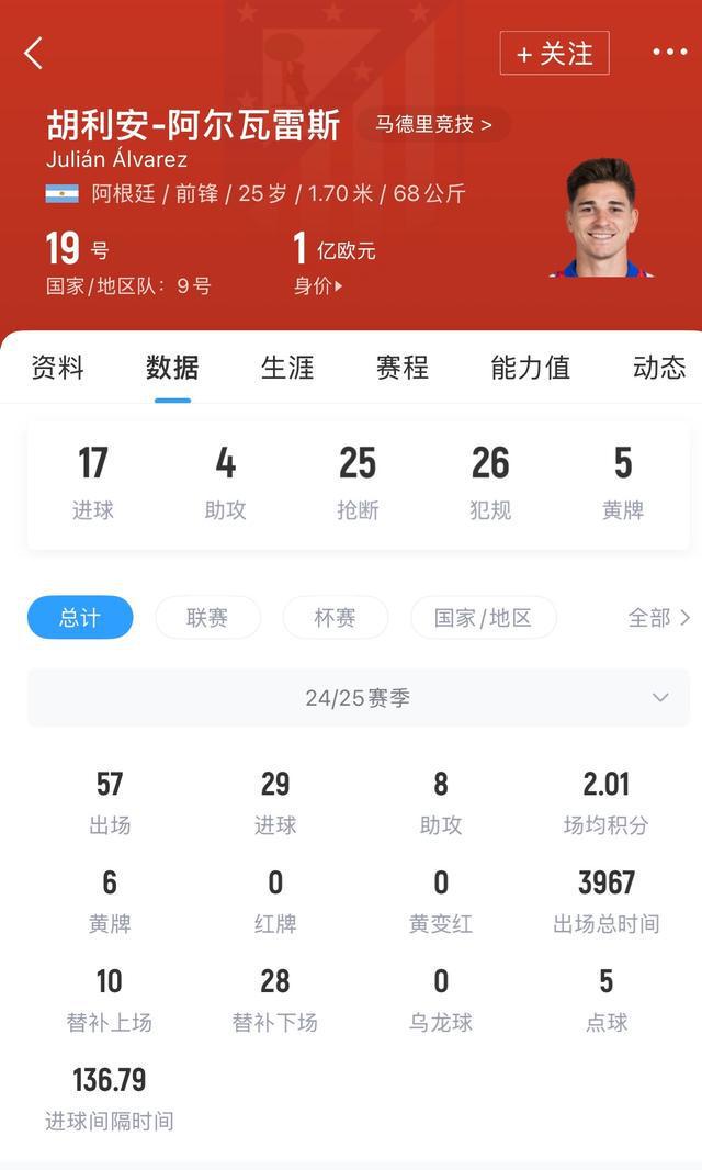阿爾瓦雷斯至今一共為馬競出場57次,其中47次首發(fā),他近一年在阿根廷、馬競與曼城總計出場5546分鐘,更難能可貴的是,小蜘蛛沒有因傷病缺席過哪怕一分鐘。