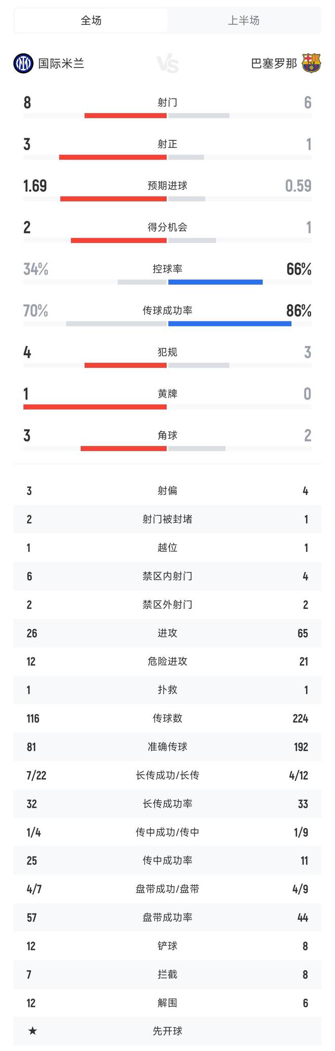 國米vs巴薩半場數(shù)據(jù):國米8射門3射正1點球 巴薩6射門1射正