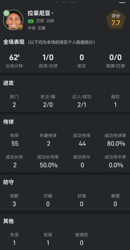 縱觀全場(chǎng)比賽,拉菲尼亞2次打門全部射正,2次過人1次成功,55次傳球成功44次,成功率88%,還暴扣2次關(guān)鍵傳球,完成2次長傳成功率為50%,防守端則也有著3次攔截,此外還有著1次失誤。